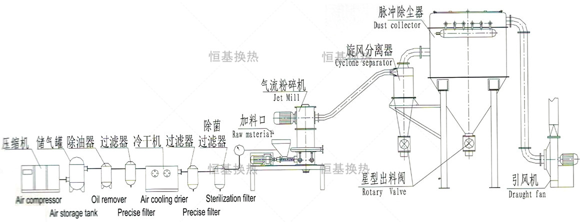 2、無污染,因為物料在氣流的帶動下密閉自身碰撞粉碎,不帶入介質,且可以通過對設備特殊處理,使物料粉碎過程中不會構成污染,控制鐵含量等因素。